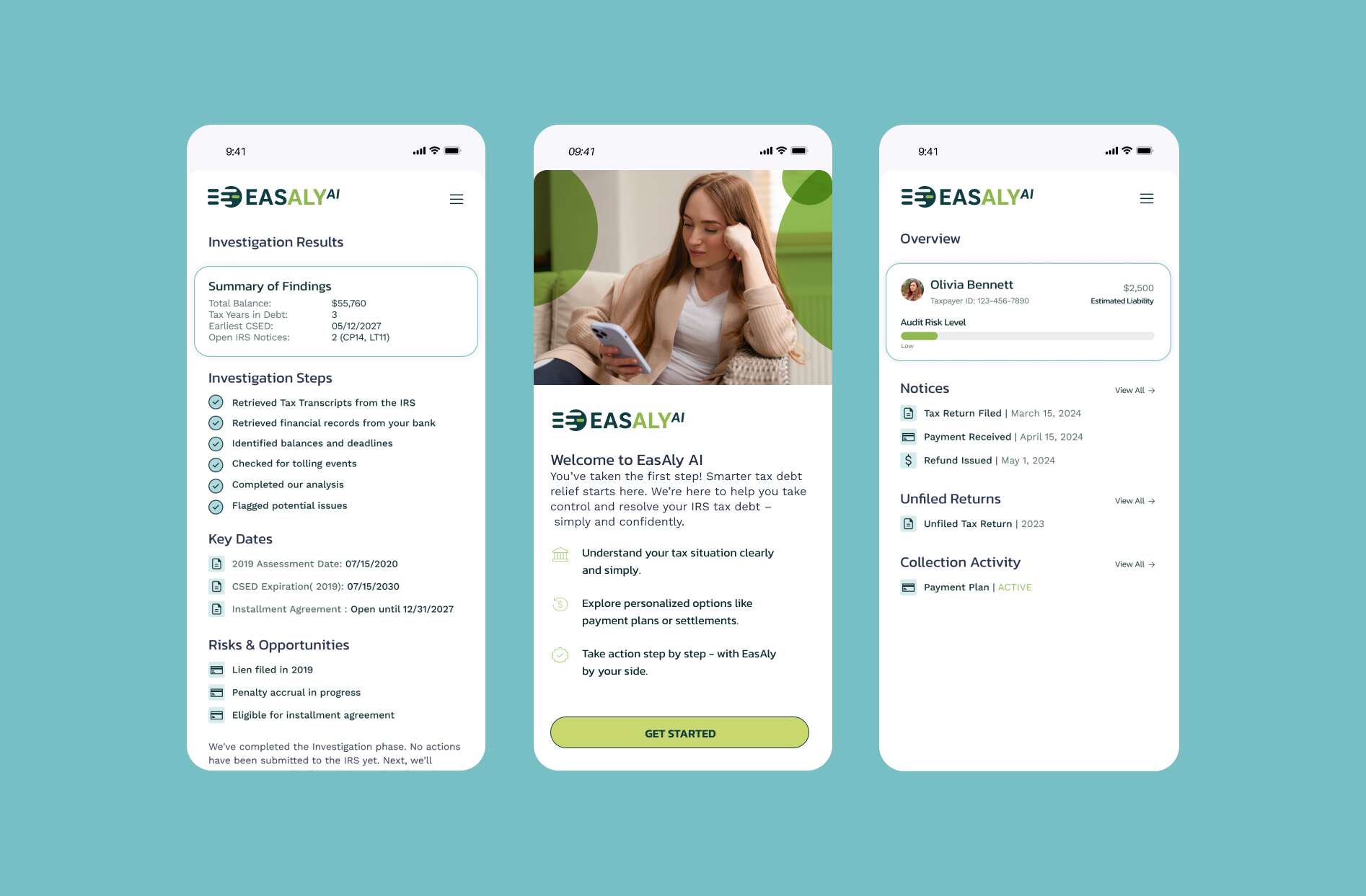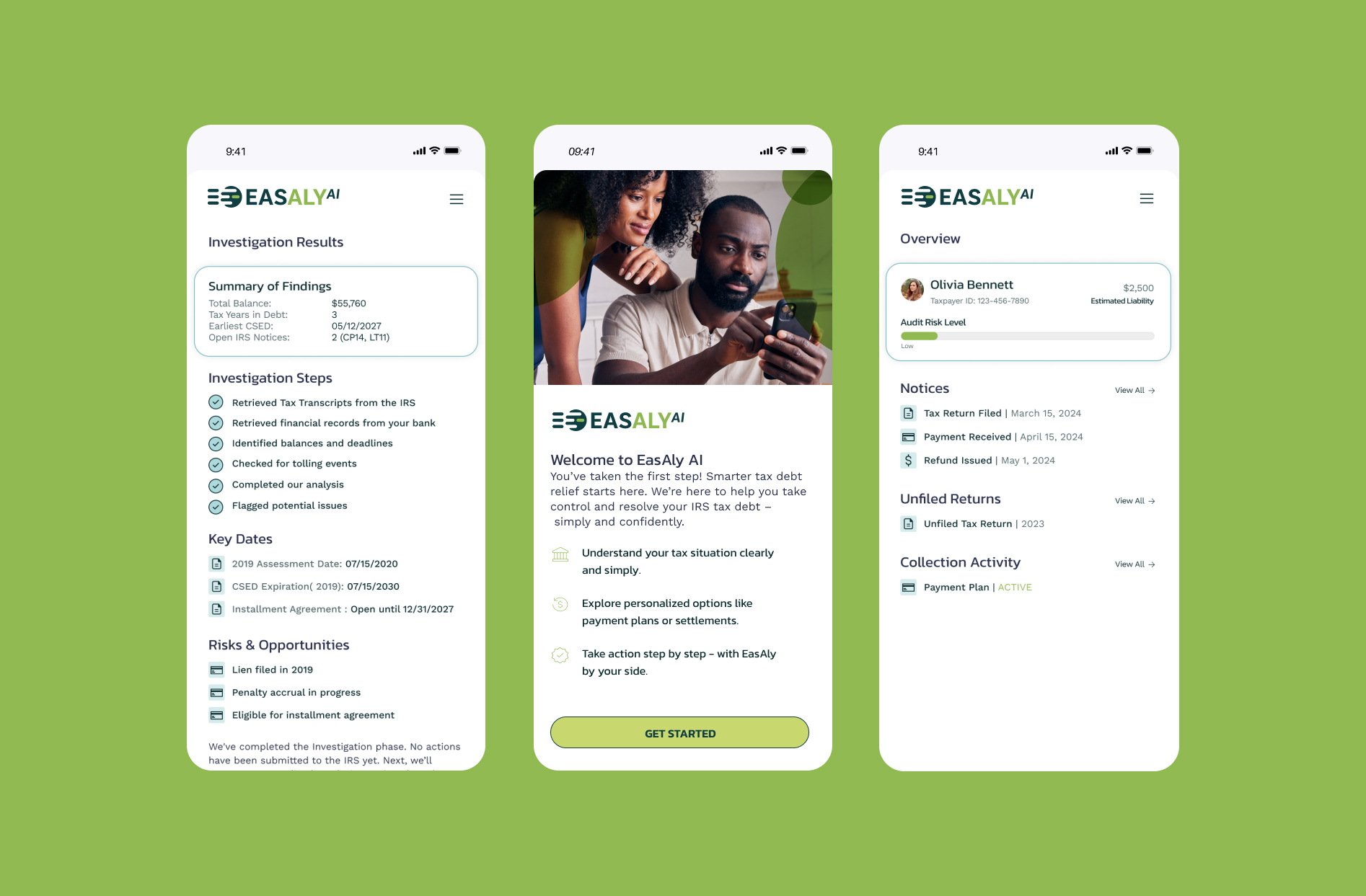 Commencez dès maintenant avec EasAly — l'application qui vous aide à comprendre votre situation fiscale auprès de l'IRS, à découvrir les possibilités d'allègement fiscal et à passer du chaos à la maîtrise de la situation.